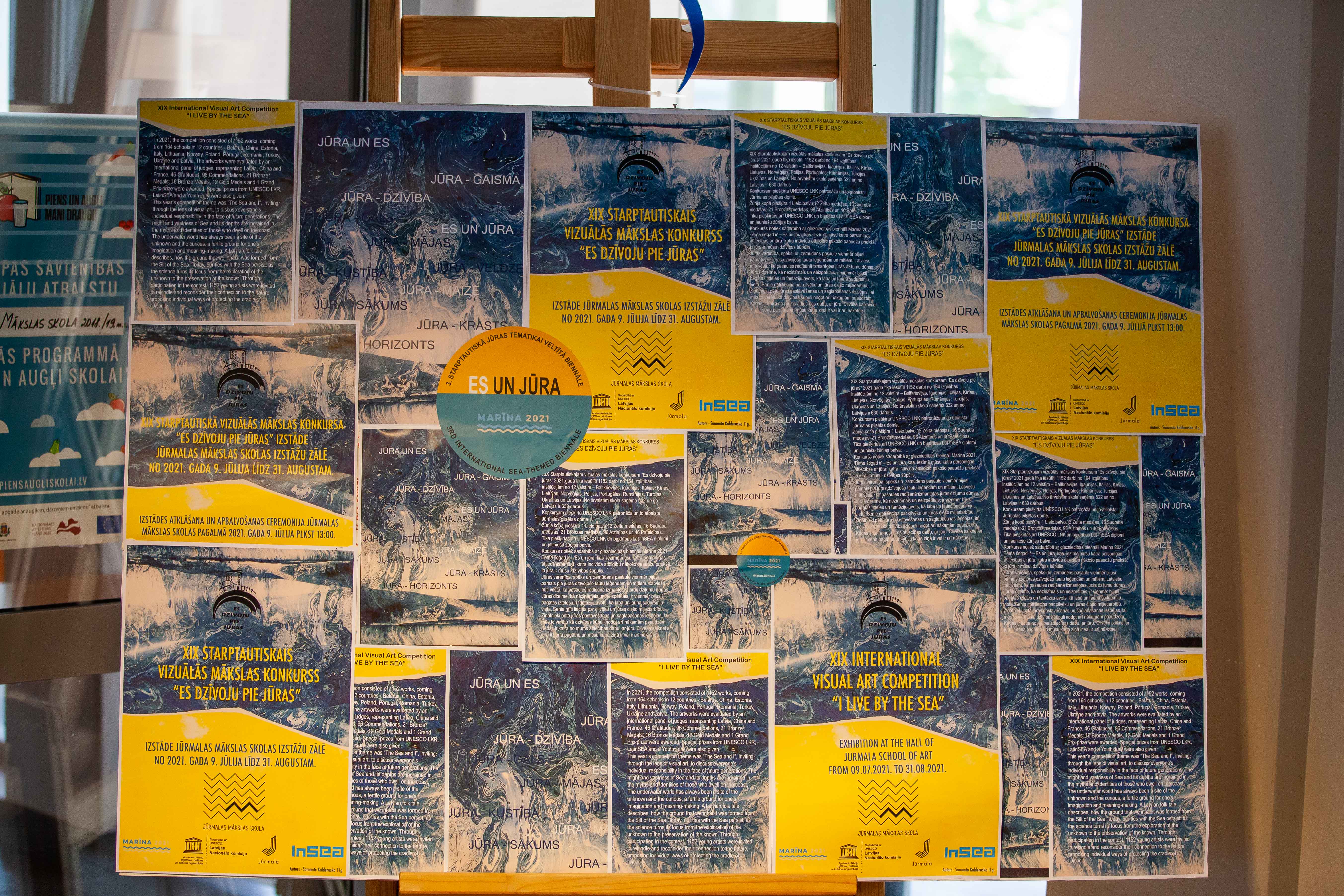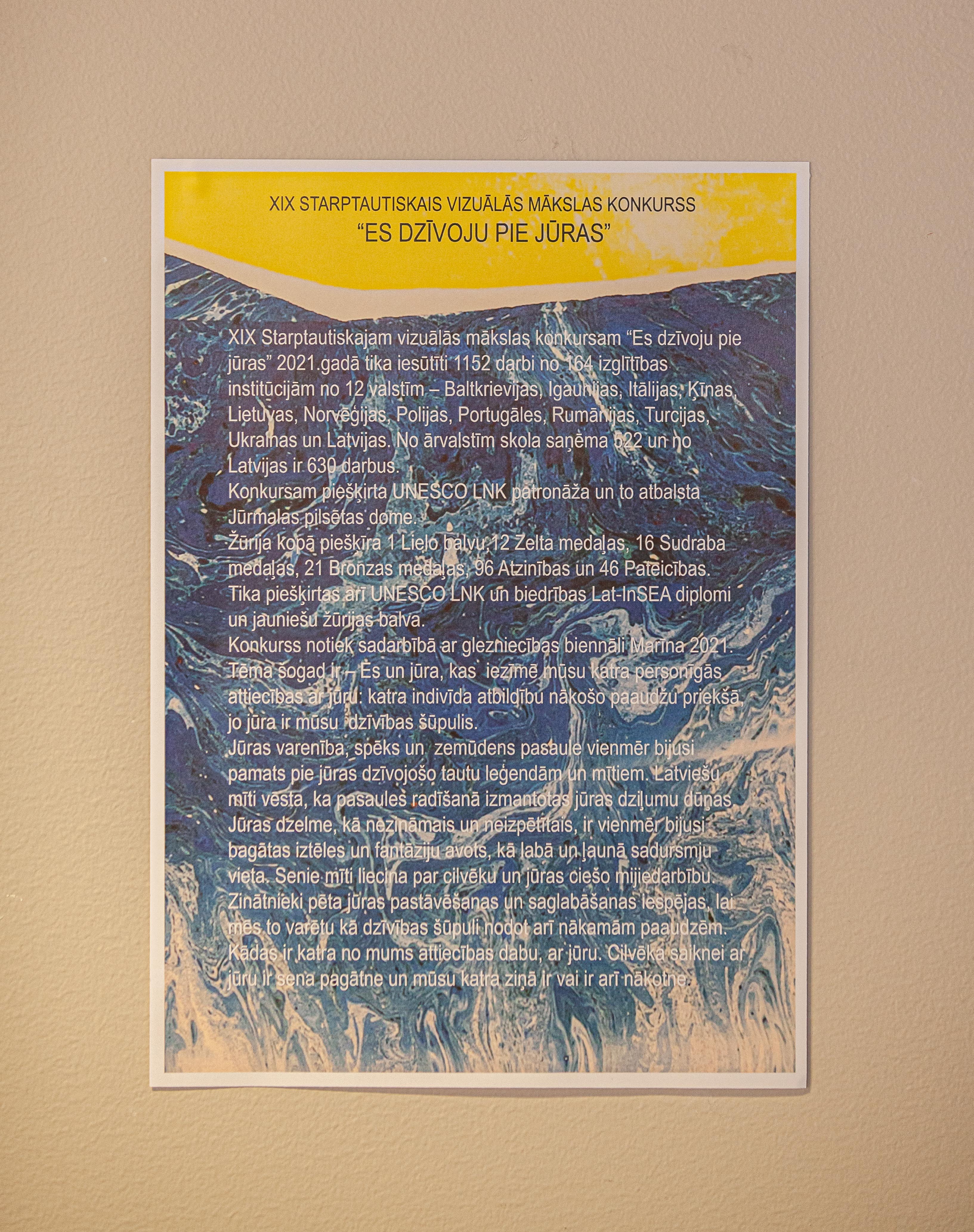 Jūrmalas Mākslas skolas izstāžu zālē atklāta XIX starptautiskā bērnu un jauniešu vizuālās mākslas konkursa “Es dzīvoju pie jūras” žūrijas izvirzīto darbu izstāde, kas ir viena no 3. starptautiskās jūras tematikai veltītās biennāles “Marīna 2021” izstādēm, kas norisināsies līdz 29. augustam.