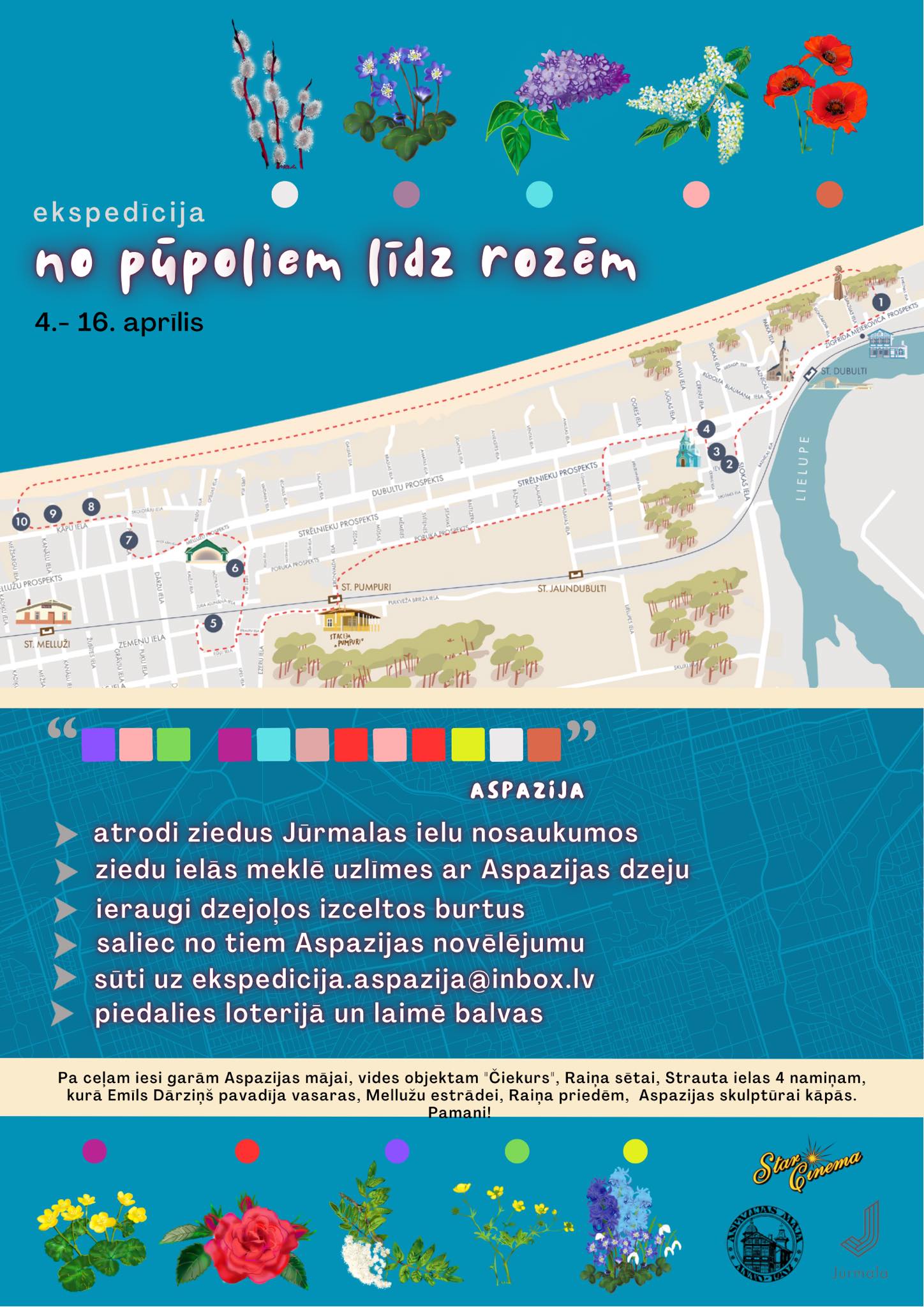 Aptuveni 12,5 kilometrus garajā ekspedīcijas “No pūpoliem līdz rozēm” maršrutā dalībniekiem jāatrod ziedi, kas “paslēpušies” Jūrmalas ielu nosaukumos. Uzmeklējot maršruta kartē norādītās ielas, ir jāuziet tajās ieslēptās ziedu uzlīmes ar Aspazijas dzejoļiem. Dzejā izceltie burti, salikti pareizā secībā, atklās dzejnieces vēlējumu pavasarim.