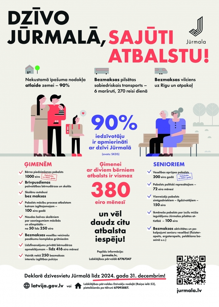 “Sniedzot atbalstu ģimenēm ar bērniem, Jūrmalas pašvaldība ir palielinājusi bērna piedzimšanas pabalstu, kas atvieglos jaunās ģimenes ikdienu laikā, kad, ģimenē ienākot mazulim, pieaug ikdienas tēriņi,” pauž Jūrmalas domes priekšsēdētāja Rita Sproģe. “Domājam arī par pensijas vecuma iedzīvotājiem, atbalstot gan materiāli, gan nodrošinot dažādus pakalpojumus veselības veicināšanai, kas senioriem Jūrmalā ir pieejami bez maksas.”