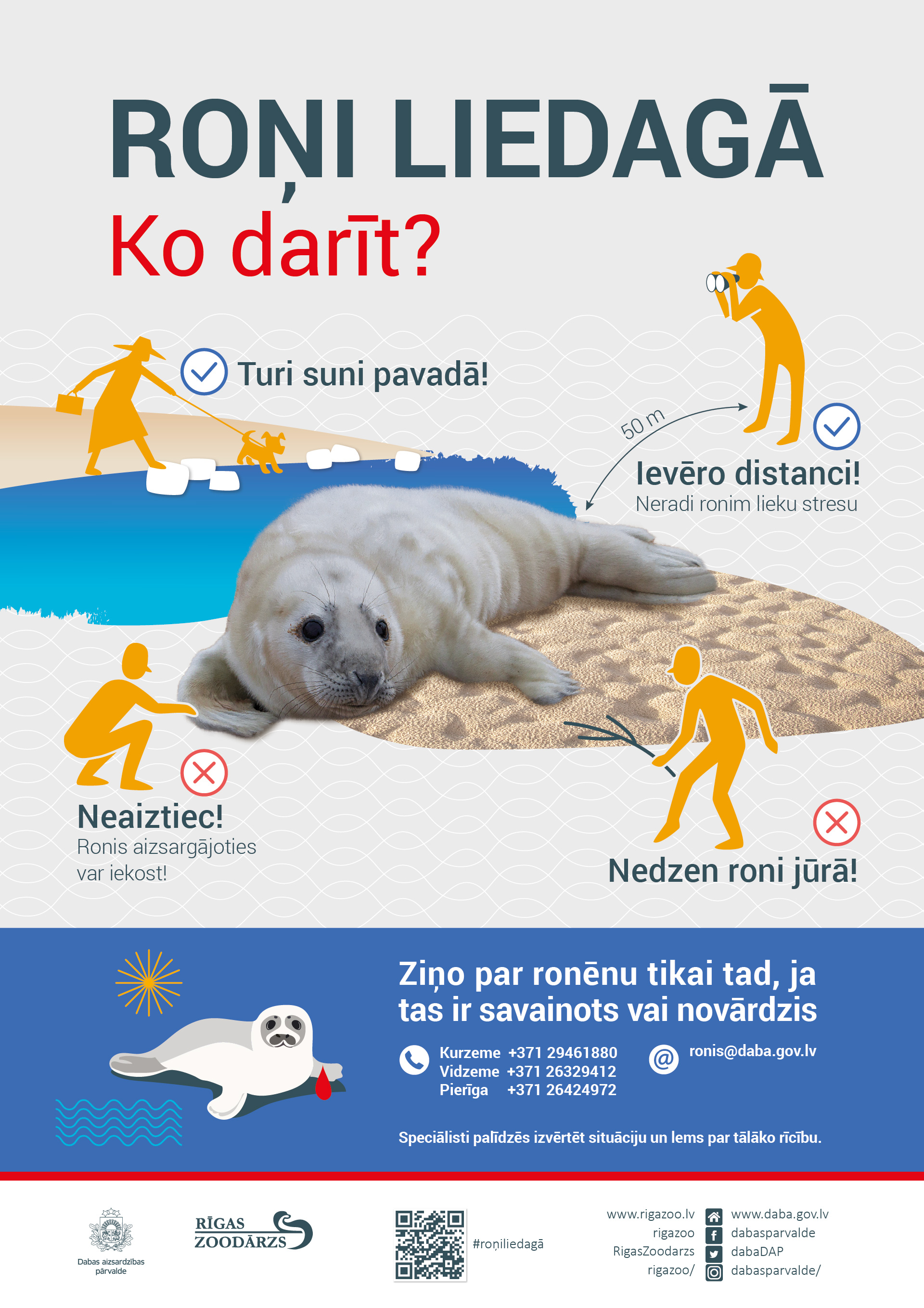 Plašāks skaidrojums par roņu mazuļiem un to, kā rīkoties, sastopot pludmalē roni, pieejama Dabas aizsardzības pārvaldes tīmekļvietnes www.daba.gov.lv sadaļā Roņi liedagā – kā rīkoties.