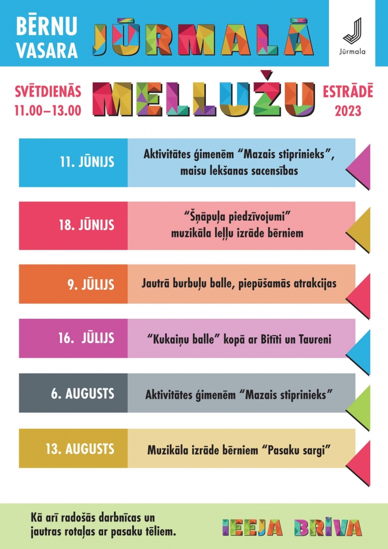 Vasarā Mellužu brīvdabas estrādē notiks cikla “Bērnu vasara” pasākumi. Divas svētdienas mēnesī no plkst. 11.00 līdz 13.00 ģimenes ar bērniem aicinātas apmeklēt pasākumus brīvā dabā un piedalīties radošās aktivitātēs.