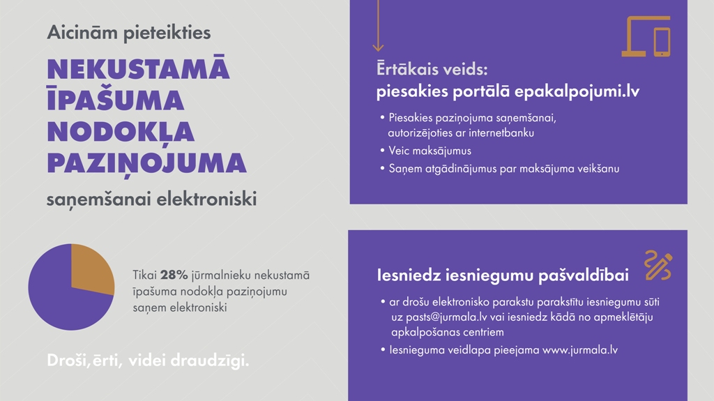 Jūrmalas pašvaldība aicina nekustamā īpašuma nodokļa maksātājus pieteikties maksājuma paziņojuma saņemšanai elektroniski. Tas ir ērti, droši un videi draudzīgi.