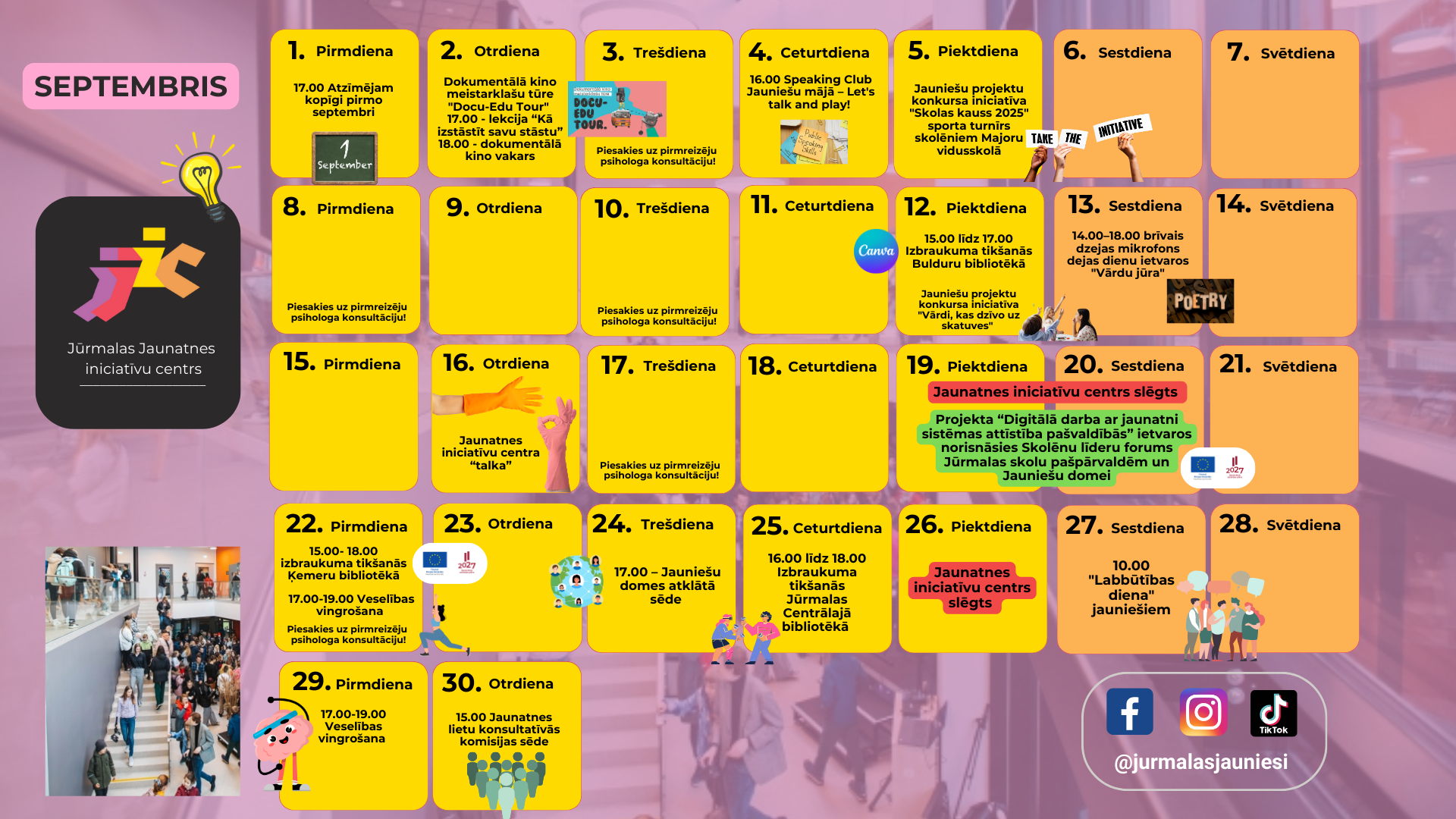 - 19-20.09. Jaunatnes iniciatīvu centrs slēgts. Projekta “Digitālā darba ar jaunatni sistēmas attīstība pašvaldībās” ietvaros norisināsies Skolēnu līderu forums Jūrmalas skolu pašpārvaldēm un Jauniešu domei.