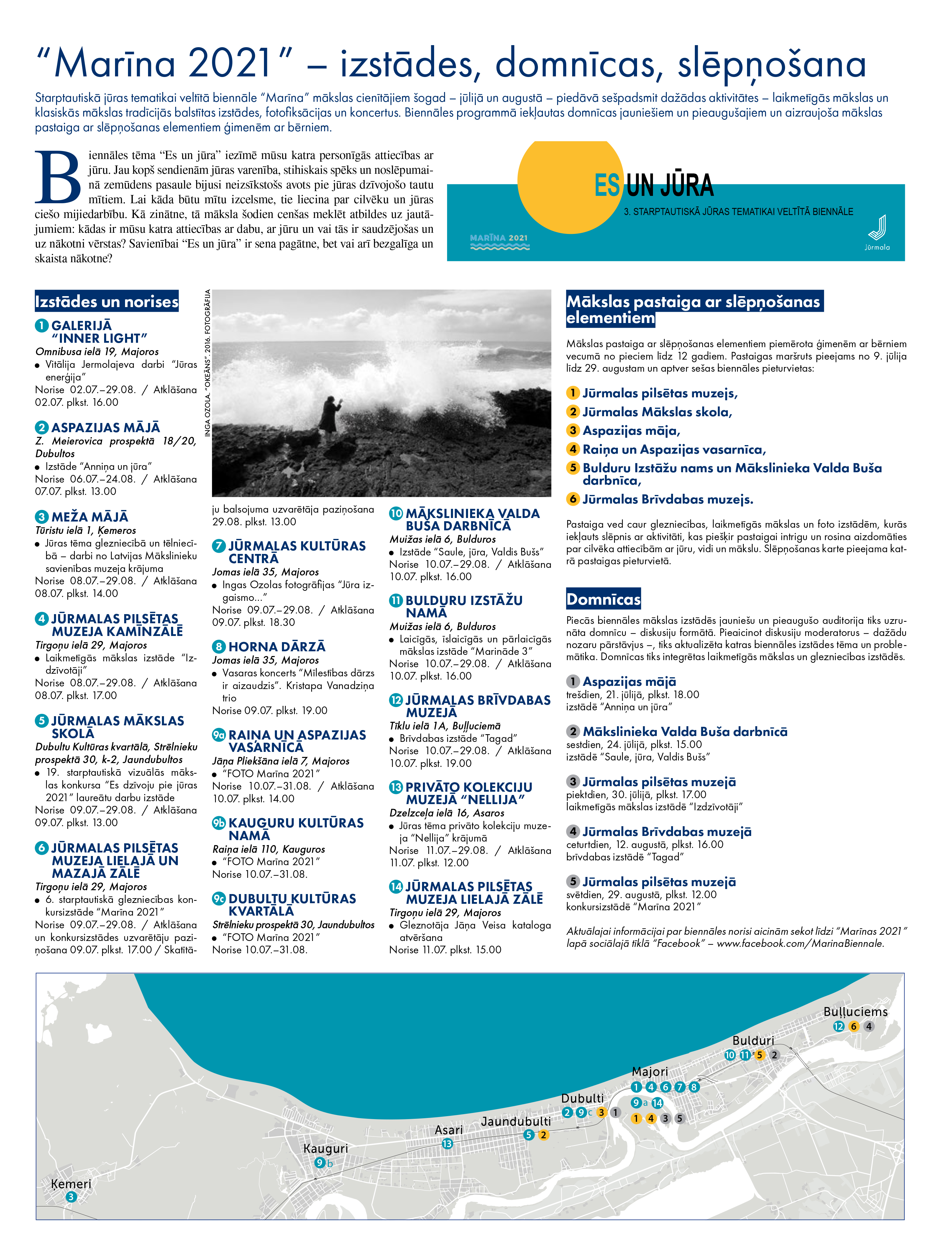 Biennāles MARĪNA 2021 tēma "Es un jūra" iezīmē mūsu katra personīgās attiecības ar jūru. Jau kopš sendienām jūras varenība, stihiskais spēks un noslēpumainā zemūdens pasaule bijusi neizsīkstošs avots pie jūras dzīvojošo tautu mītiem. Arī latviešu mīti vēsta, ka pasauli Dievs un Velns radījuši, izmantojot jūras dzelmes dūņas. Lai kāda būtu mītu izcelsme, tie liecina par cilvēku un jūras ciešo mijiedarbību. Kā zinātne, tā māksla šodien cenšas meklēt atbildes uz jautājumiem: kādas ir katra no mums attiecības ar dabu, ar jūru un vai tās ir saudzējošas un uz nākotni vērstas? Savienībai "Es un jūra" ir sena pagātne, bet vai arī bezgalīga un skaista nākotne?